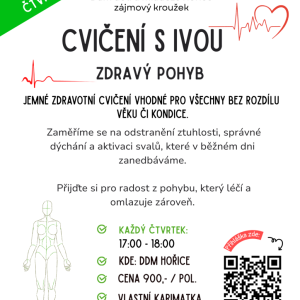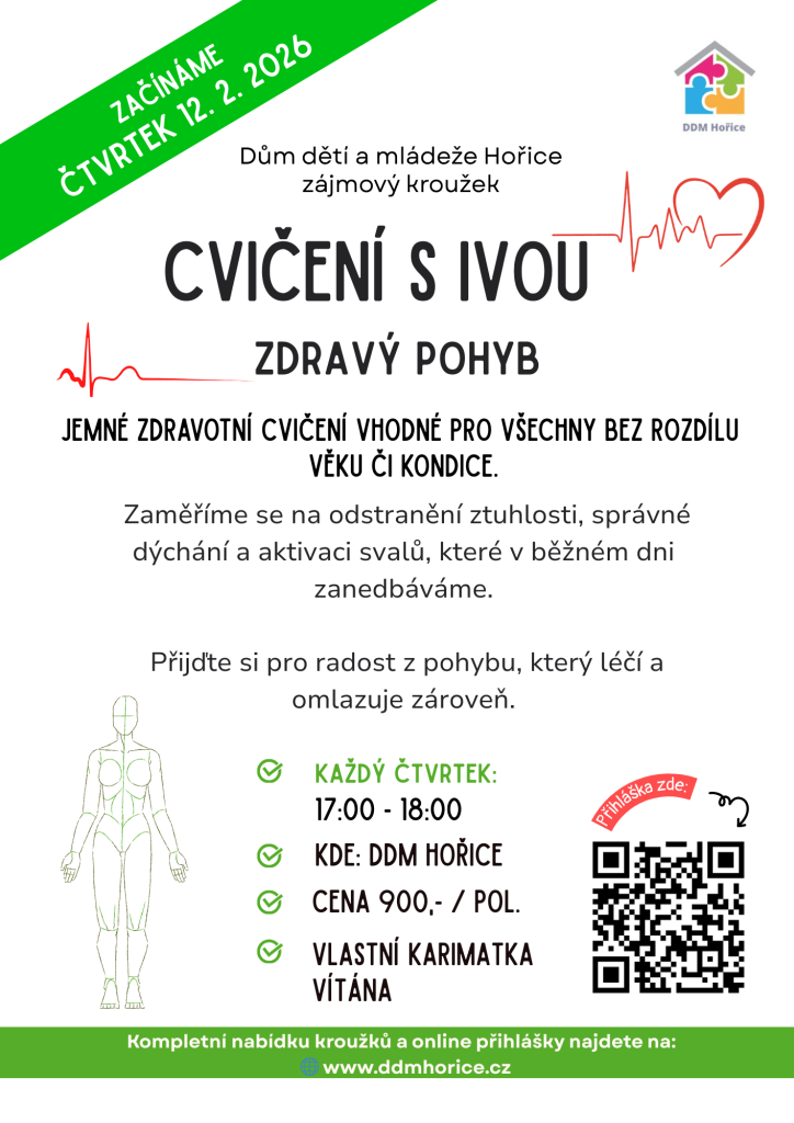 26.01.2026 Ve čtvrteční podvečer si můžete přijít s Ivou Benešovou zdravě zacvičit. Více informacích o zájmovém útvaru naleznete v sekci kroužky.