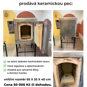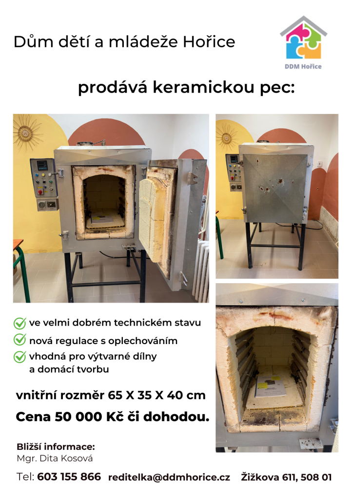 27.01.2026 Vážení, k prodeji nabízíme plně funkční keramickou pec. Více informací vám poskytne ředitelka DDM.