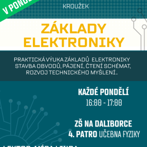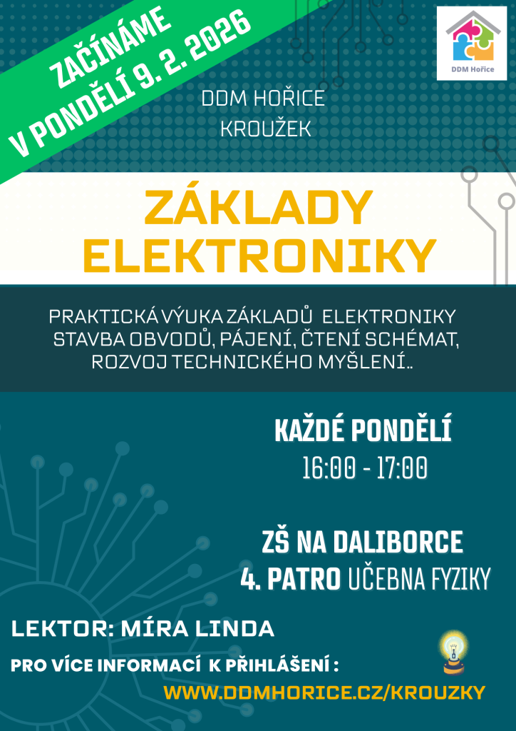 Nově otevíráme kroužek! Základy elektroniky. Praktická výuka základů elektroniky. Stavba obvodů, pájení, čtení schémat, rozvoj technického myšlení..
