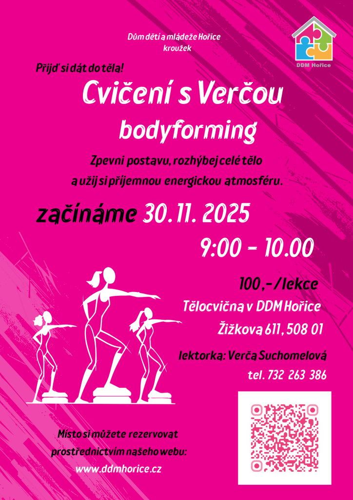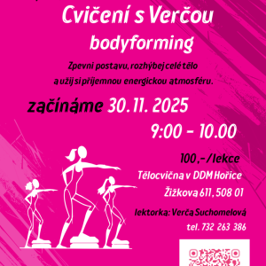 Již od 30.11.2025 otvíráme nový zájmový sportovní útvar - cvičení s Verčou - bodyforming. Chcete zpevnit postavu, získat energii a udělat něco pro sebe? Lekce nabízí posilování celého těla: dřepy, výpady, posilování břicha i zad, cviky s minibandy, balanční cviky, lehké kardio pro zlepšení kondice. Vstupné je 100,-/ lekce, které probíhají v DDM Hořice každou neděli od 9:00-10:00. Bude se na vás těšit zkušená lektorka Veronika Suchomelová.