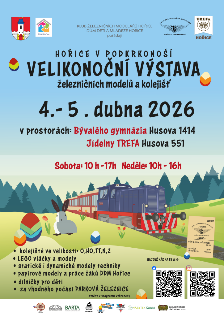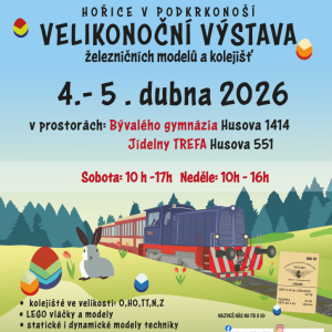 04.04.2026 Velikonoční železniční výstava Po roce se do Hořice vrací oblíbená Velikonoční železniční výstava. Návštěvníci se mohou těšit na modelová kolejiště různých velikostí, LEGO vláčky, statické i pohyblivé modely a také tvořivé dílničky pro děti. Za příznivého počasí bude v provozu i parková železn...