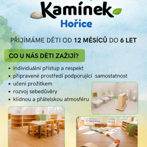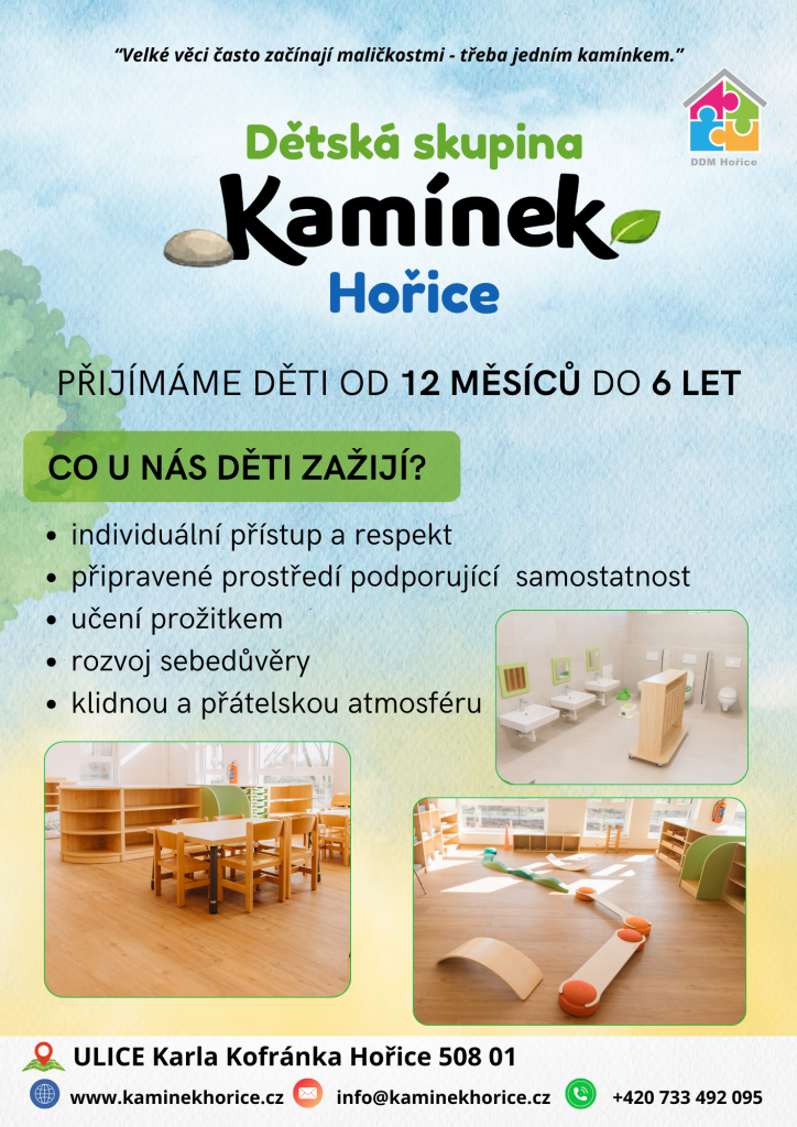 25.03.2026 O nás Dětská skupina Kamínek Hořice je bezpečné a vstřícné místo pro malé objevitele a pozorovatele světa. Stejně jako každý kamínek je jedinečný, i u nás respektujeme jedinečné tempo každého dítěte. Učíme se skrze zkušenost, dotek, pohyb a hru. Necháváme děti růst v rytmu přírody a běžného živo...